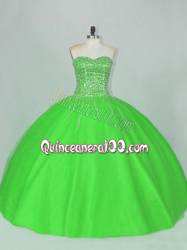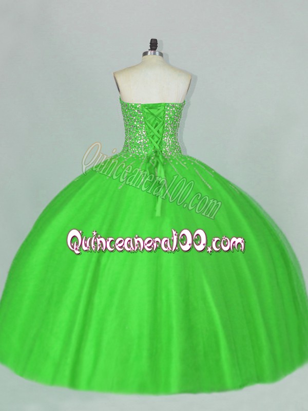Neckline : SweetheartShown Color : GreenSilhouette : Ball GownsSleeve Length : sleevelessHemline : floor lengthBack Detail : Lace upFabric : TulleEmbellishment : BeadingOccasion : Sweet 16,QuinceaneraSeason : Spring,Summer,Fall,Winter