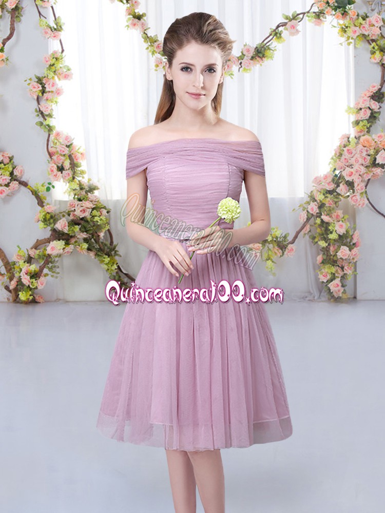 Neckline : Off the shoulder Shown Color : Pink Silhouette : Empire Sleeve Length : short sleeves Hemline : knee length Back Detail : Lace up Fabric : Tulle Embellishment : Belt Occasion : Wedding Party Season : Spring,Summer,Fall