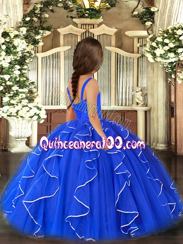 Neckline : StrapsShown Color : Royal BlueSilhouette : Ball GownsSleeve Length : sleevelessHemline : floor lengthBack Detail : Lace upFabric : TulleEmbellishment : RufflesOccasion : Party,Sweet 16,Wedding PartySeason : Spring,Summer,Fall