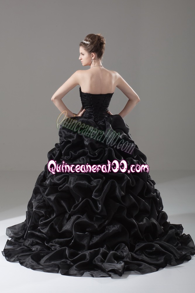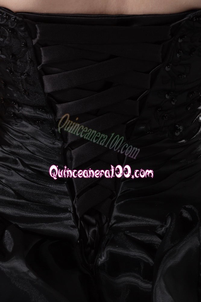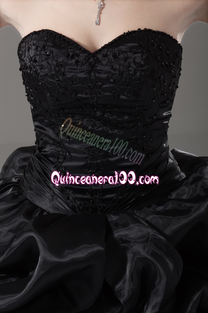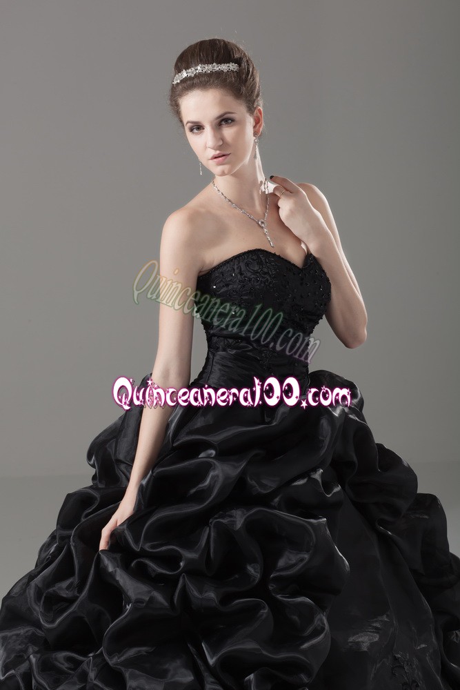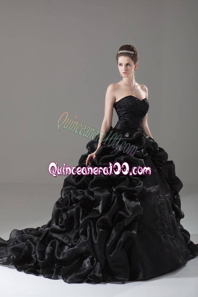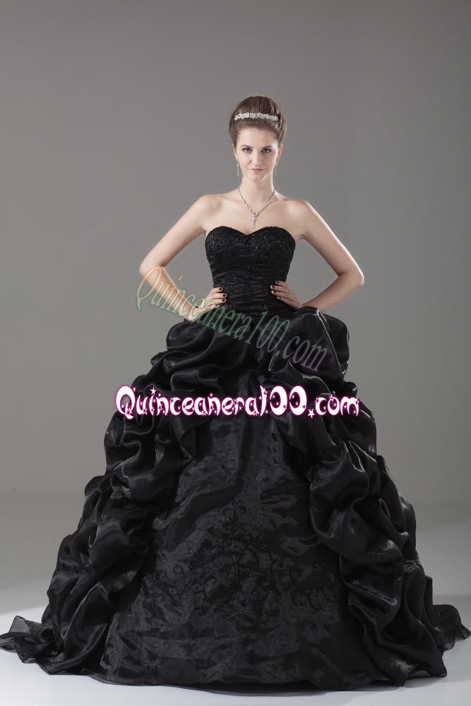Neckline : SweetheartShown Color : BlackSilhouette : Ball GownsSleeve Length : sleevelessBack Detail : Lace upFabric : OrganzaEmbellishment : Embroidery,Pick UpsOccasion : Sweet 16,QuinceaneraSeason : Spring,Summer,Fall,Winter