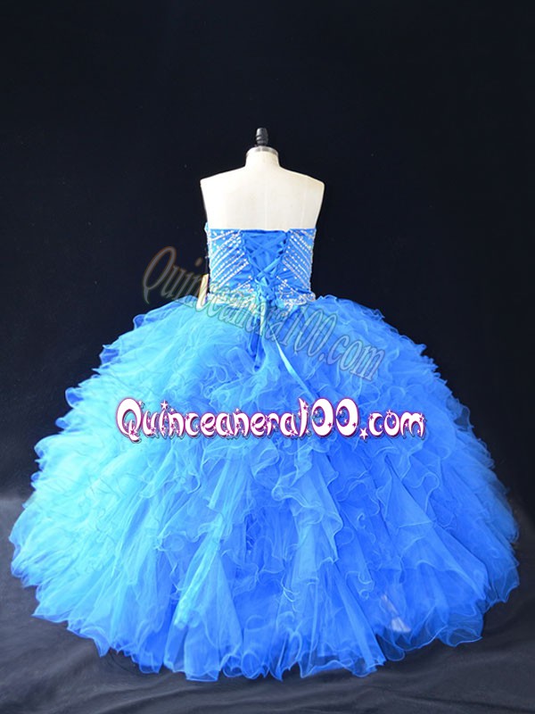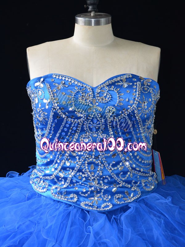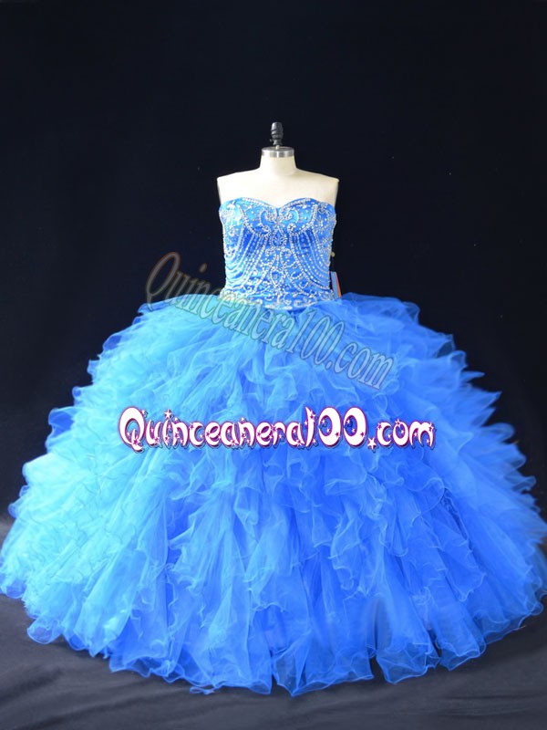 Neckline : SweetheartShown Color : BlueSilhouette : Ball GownsSleeve Length : sleevelessHemline : floor lengthBack Detail : Lace upFabric : OrganzaEmbellishment : Beading,RufflesOccasion : Sweet 16,QuinceaneraSeason : Spring,Summer,Fall,Winter