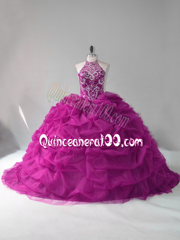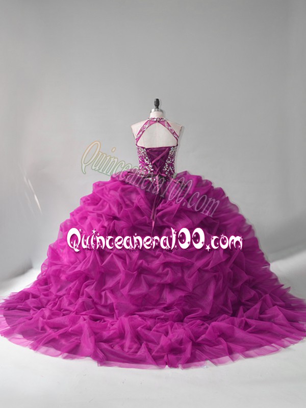 Neckline : Halter topShown Color : FuchsiaSilhouette : Ball GownsSleeve Length : sleevelessBack Detail : Lace upFabric : OrganzaEmbellishment : Beading,Pick UpsOccasion : Sweet 16,QuinceaneraSeason : Spring,Summer,Fall,Winter