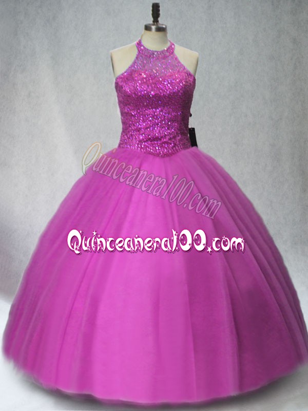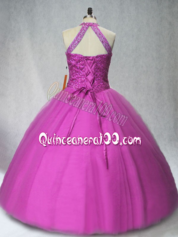 Neckline : Halter topShown Color : PurpleSilhouette : Ball GownsSleeve Length : sleevelessHemline : floor lengthBack Detail : Lace upFabric : TulleEmbellishment : BeadingOccasion : Sweet 16,QuinceaneraSeason : Spring,Summer,Fall,Winter