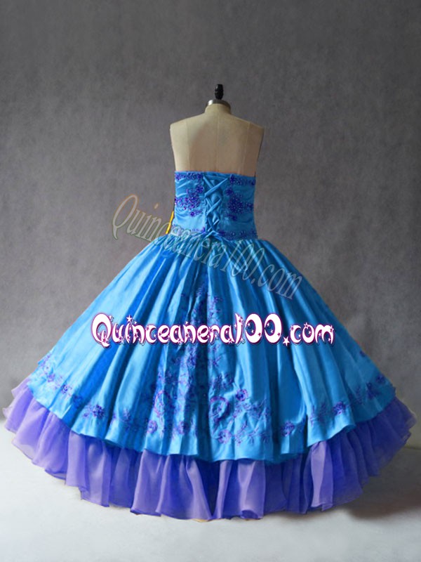 Neckline : SweetheartShown Color : BlueSilhouette : Ball GownsSleeve Length : sleevelessHemline : floor lengthBack Detail : Lace upFabric : Satin,OrganzaEmbellishment : EmbroideryOccasion : Sweet 16,QuinceaneraSeason : Spring,Summer,Fall,Winter