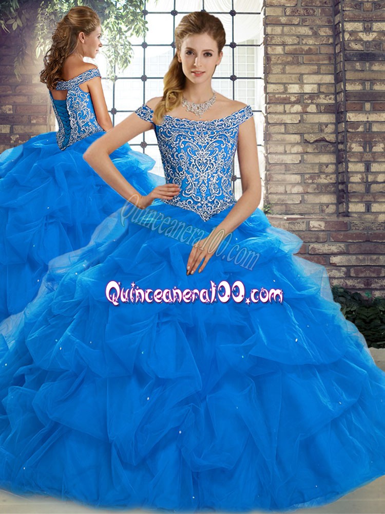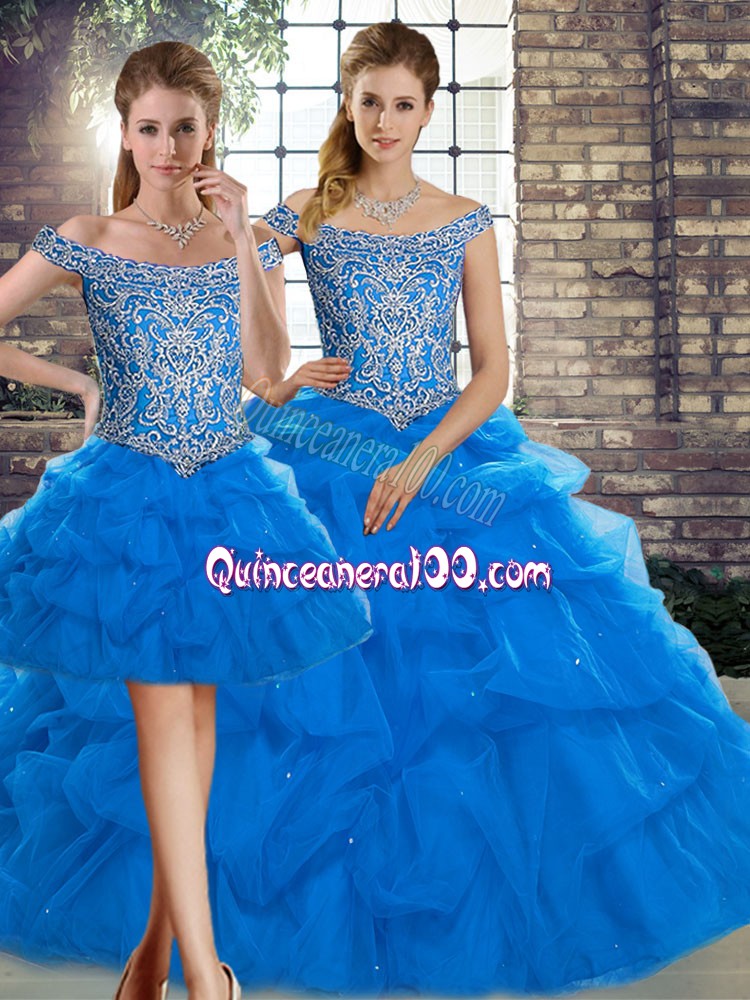 Sexy Blue Three Pieces Off The Shoulder Sleeveless Tulle Brush Train Lace Up Beading and Pick Ups Sweet 16 Dress