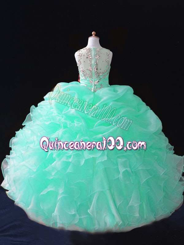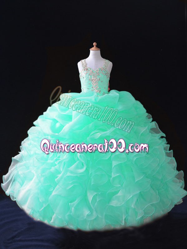 Neckline : StrapsShown Color : Apple GreenSilhouette : Ball GownsSleeve Length : sleevelessHemline : floor lengthBack Detail : ZipperFabric : OrganzaEmbellishment : Beading,Ruffles,Pick UpsOccasion : Wedding PartySeason : Spring,Summer,Fall,Winter