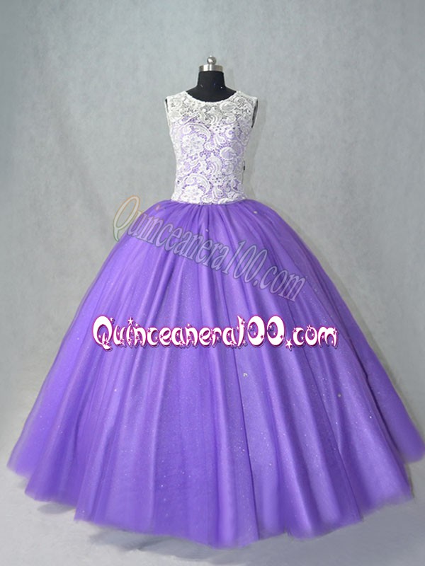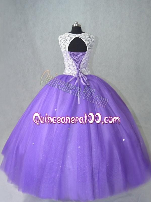 Neckline : ScoopShown Color : LavenderSilhouette : Ball GownsSleeve Length : sleevelessHemline : floor lengthBack Detail : Lace upFabric : TulleEmbellishment : LaceOccasion : Sweet 16,QuinceaneraSeason : Spring,Summer,Fall,Winter