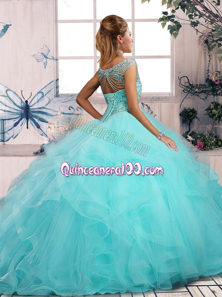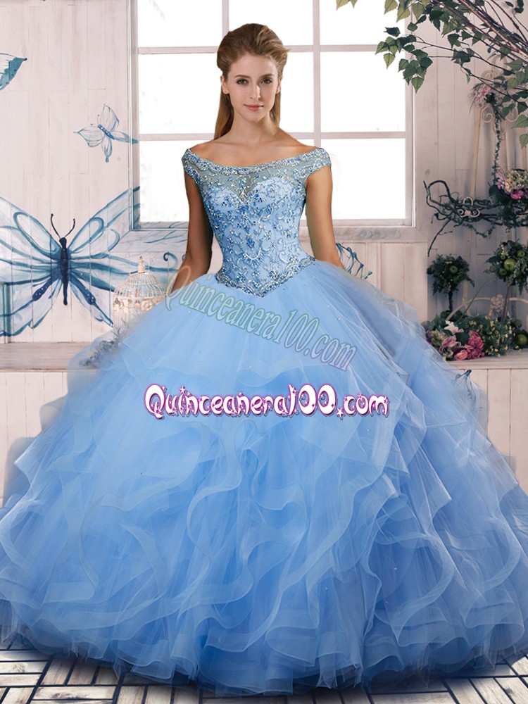 Neckline : Off the shoulderShown Color : BlueSilhouette : Ball GownsSleeve Length : sleevelessHemline : floor lengthBack Detail : Lace upFabric : TulleEmbellishment : Beading,RufflesOccasion : Sweet 16,QuinceaneraSeason : Spring,Summer,Fall,Winter