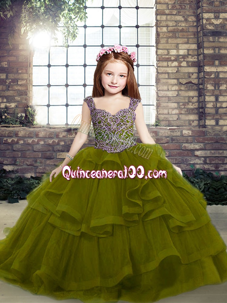 Neckline : StrapsShown Color : Olive GreenSilhouette : Ball GownsSleeve Length : sleevelessHemline : floor lengthBack Detail : Lace upFabric : OrganzaEmbellishment : Beading,RufflesOccasion : Party,Military Ball,Wedding PartySeason : Spring,Summer,Fall,Winter