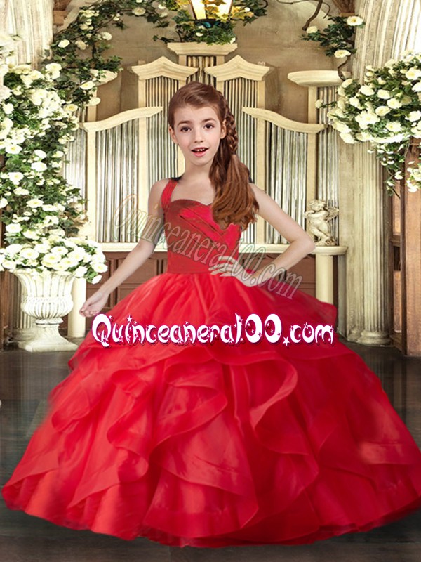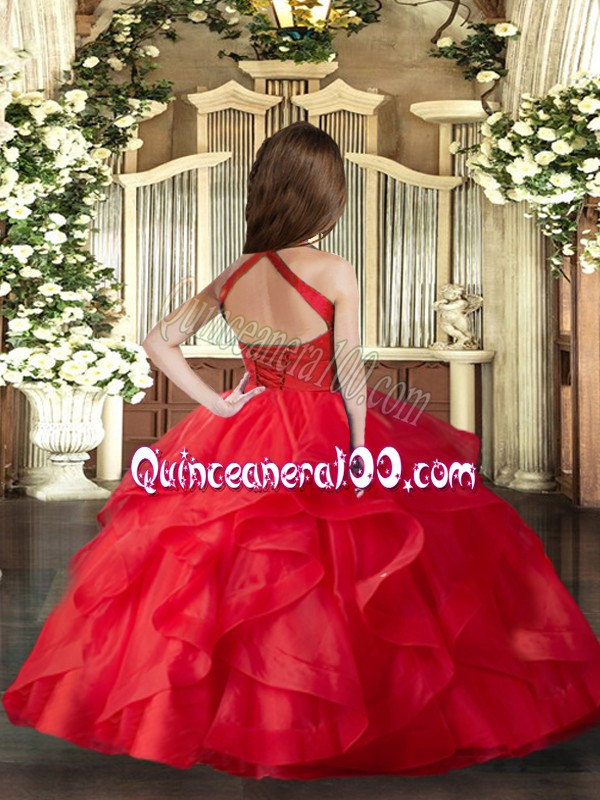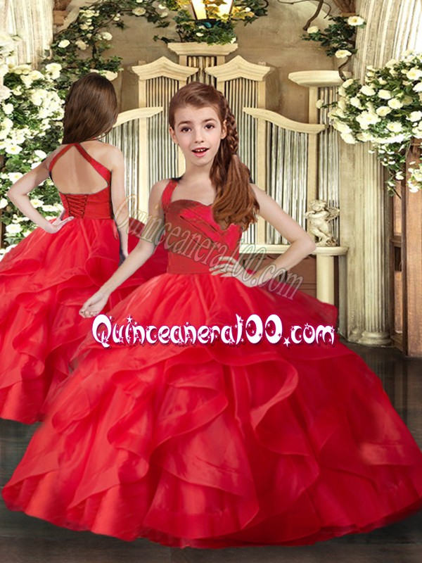 Neckline : StrapsShown Color : RedSilhouette : Ball GownsSleeve Length : sleevelessHemline : floor lengthBack Detail : Lace upFabric : TulleEmbellishment : Ruffles,RuchingOccasion : Party,Sweet 16,Wedding PartySeason : Spring,Summer,Fall,Winter