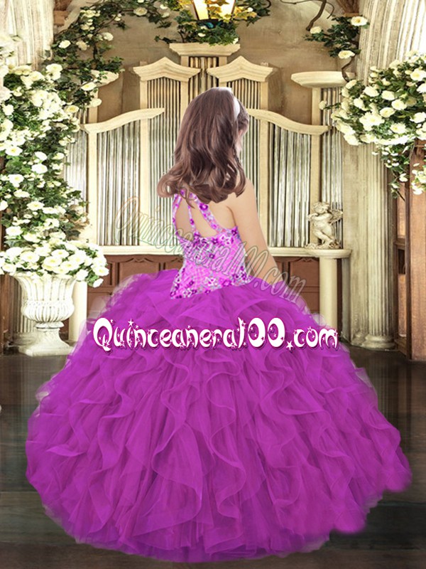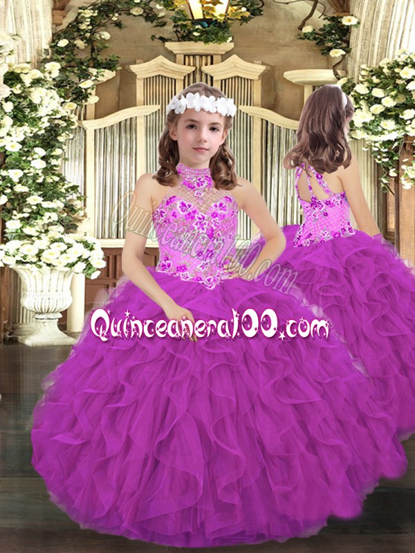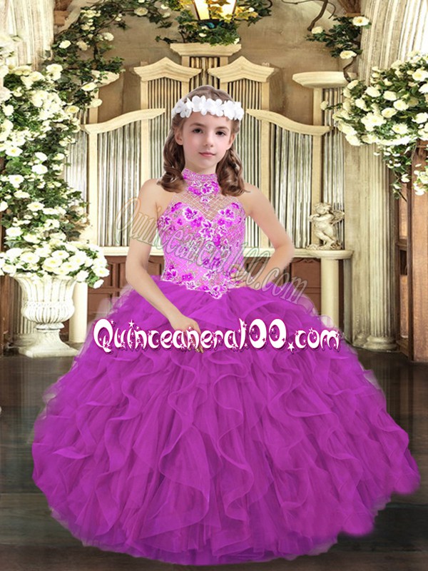 Neckline : Halter topShown Color : PurpleSilhouette : Ball GownsSleeve Length : sleevelessHemline : floor lengthBack Detail : Lace upFabric : TulleEmbellishment : Embroidery,RufflesOccasion : Party,Wedding PartySeason : Spring,Summer,Fall,Winter