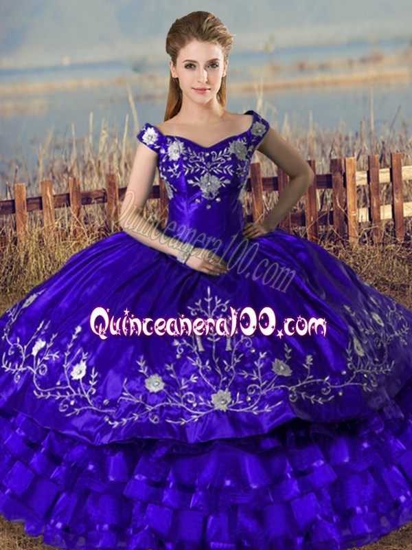 Neckline : Off the shoulderShown Color : PurpleSilhouette : Ball GownsSleeve Length : sleevelessHemline : floor lengthBack Detail : Lace upFabric : Satin,OrganzaEmbellishment : Embroidery,Ruffled LayersOccasion : Sweet 16,QuinceaneraSeason : Spring,Summer,Fall,Winter