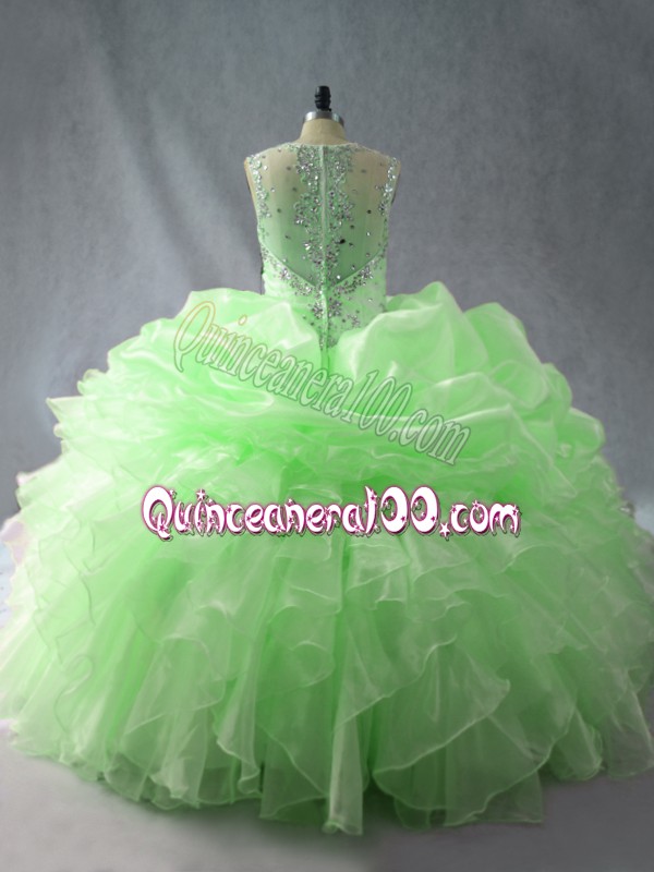 Neckline : StrapsShown Color : Spring GreenSilhouette : Ball GownsSleeve Length : sleevelessHemline : floor lengthBack Detail : ZipperFabric : OrganzaEmbellishment : Beading,Ruffles,Pick UpsOccasion : Sweet 16,QuinceaneraSeason : Spring,Summer,Fall,Winter
