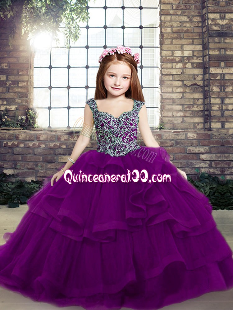 Neckline : StrapsShown Color : PurpleSilhouette : Ball GownsSleeve Length : sleevelessHemline : floor lengthBack Detail : Lace upFabric : TulleEmbellishment : BeadingOccasion : Military Ball,Wedding PartySeason : Spring,Summer,Fall,Winter