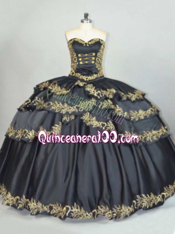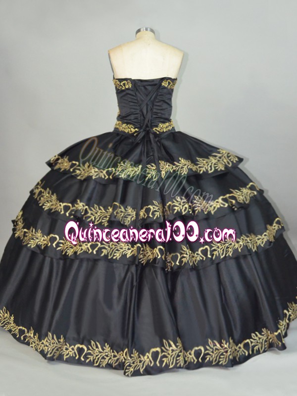 Neckline : SweetheartShown Color : BlackSilhouette : Ball GownsSleeve Length : sleevelessHemline : floor lengthBack Detail : Lace upFabric : SatinEmbellishment : EmbroideryOccasion : Sweet 16,QuinceaneraSeason : Spring,Summer,Fall,Winter