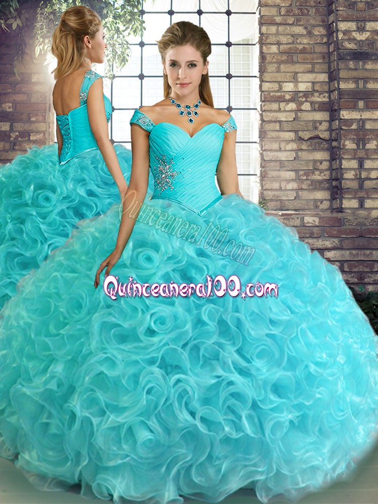 Neckline : Off the shoulder Shown Color : Aqua Blue Silhouette : Two Pieces Sleeve Length : sleeveless Hemline : floor length Back Detail : Lace up Fabric : Fabric With Rolling Flowers Embellishment : Beading Occasion : Military Ball,Sweet 16,Quinceanera Season : Spring,Summer,Fall,Winter