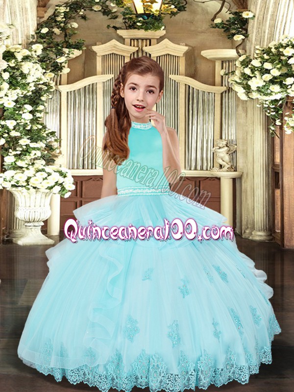 Neckline : Halter topShown Color : Aqua BlueSilhouette : Ball GownsSleeve Length : sleevelessHemline : floor lengthBack Detail : BacklessFabric : TulleEmbellishment : Beading,AppliquesOccasion : Party,Sweet 16,Wedding PartySeason : Spring,Summer,Fall,Winter