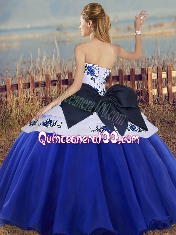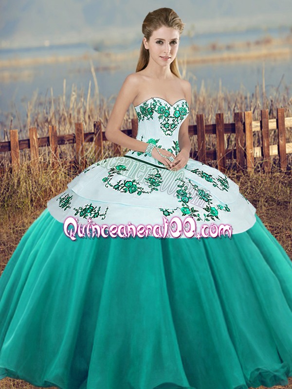 Neckline : SweetheartShown Color : TurquoiseSilhouette : Ball GownsSleeve Length : sleevelessHemline : floor lengthBack Detail : Lace upFabric : TulleEmbellishment : Embroidery,BowknotOccasion : Military Ball,Sweet 16,QuinceaneraSeason : Spring,Summer,Fall,Winter