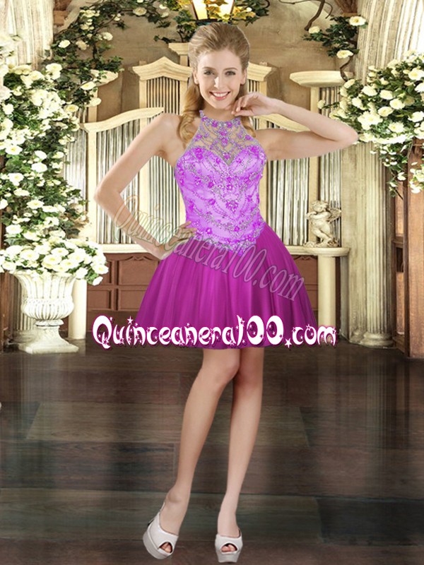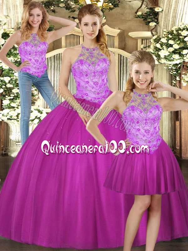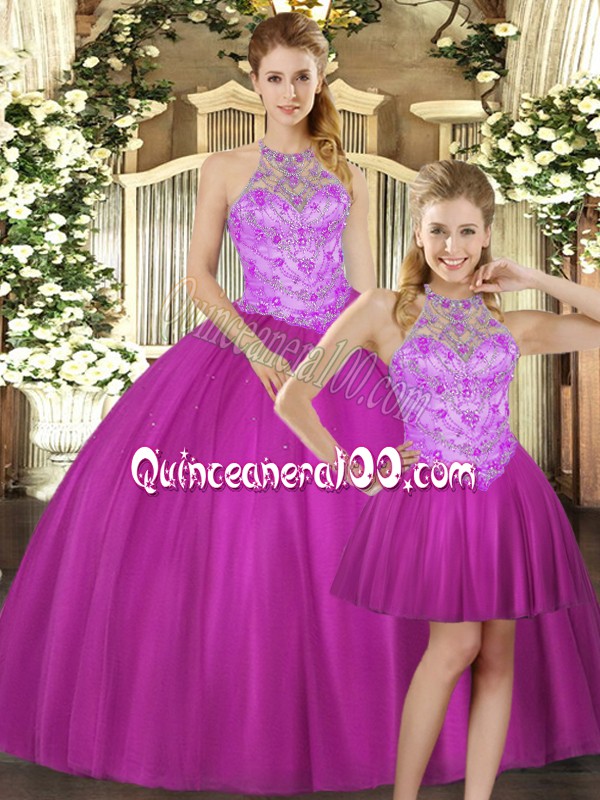 Neckline : Halter topShown Color : FuchsiaSilhouette : Ball GownsSleeve Length : sleevelessHemline : floor lengthBack Detail : Lace upFabric : TulleEmbellishment : BeadingOccasion : Sweet 16,QuinceaneraSeason : Spring,Summer,Fall,Winter