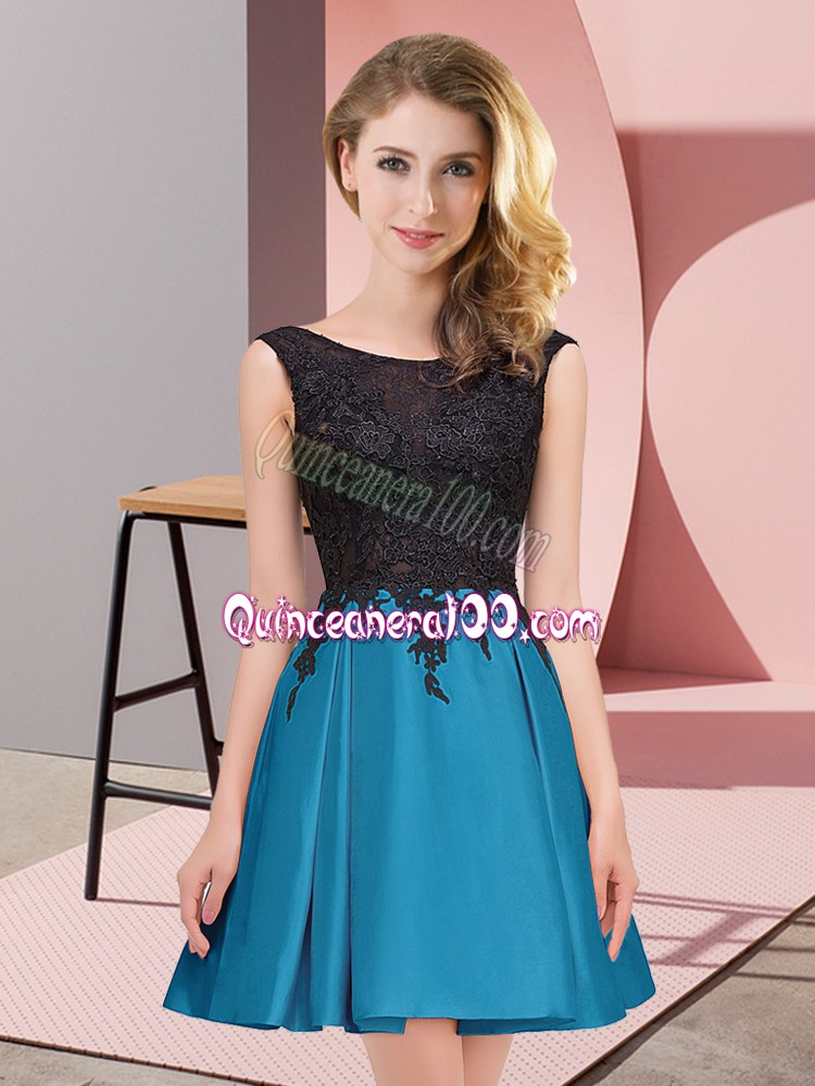 Neckline : ScoopShown Color : Teal Silhouette : A-lineSleeve Length : sleevelessHemline : mini lengthBack Detail : ZipperFabric : SatinEmbellishment : LaceOccasion : Wedding PartySeason : Spring,Summer,Fall