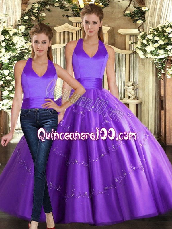 Neckline : Halter topShown Color : PurpleSilhouette : Ball GownsSleeve Length : sleevelessHemline : floor lengthBack Detail : Lace upFabric : TulleEmbellishment : BeadingOccasion : Sweet 16,QuinceaneraSeason : Spring,Summer,Fall,Winter
