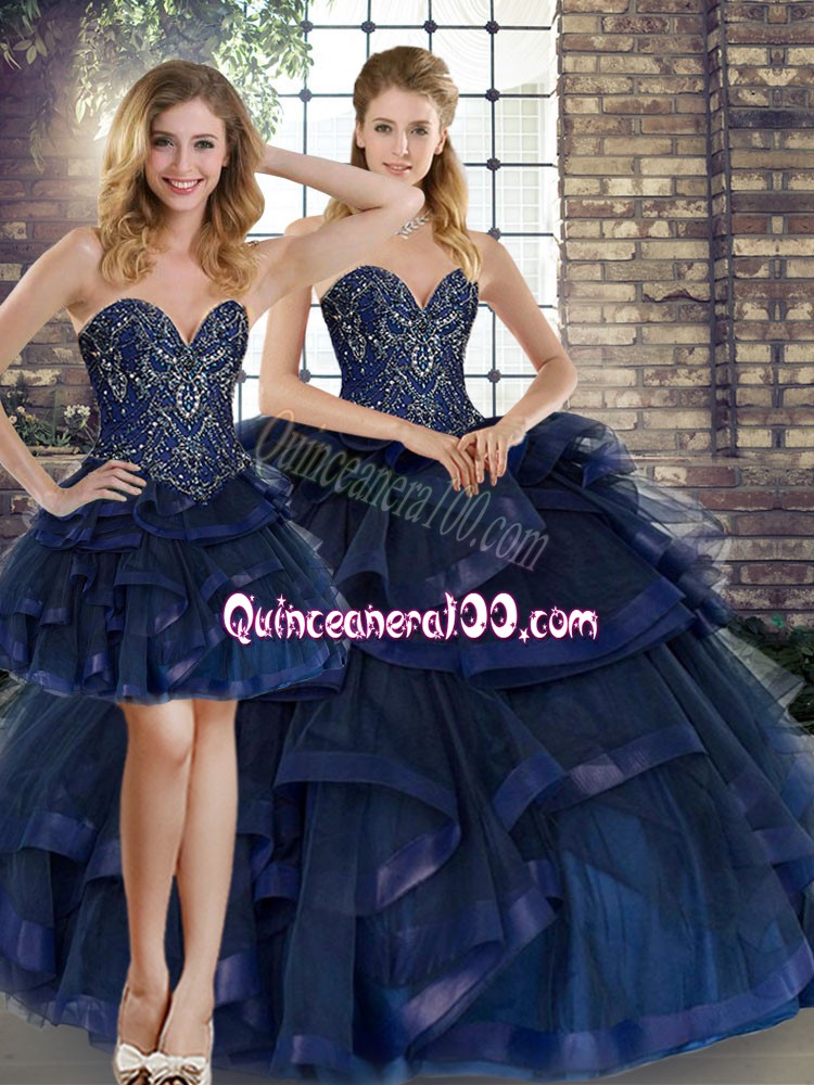 Neckline : Sweetheart Shown Color : Navy Blue Silhouette : Three Pieces Sleeve Length : sleeveless Hemline : floor length Back Detail : Lace up Fabric : Tulle Embellishment : Beading,Ruffles Occasion : Military Ball,Sweet 16,Quinceanera Season : Spring,Summer,Fall,Winter