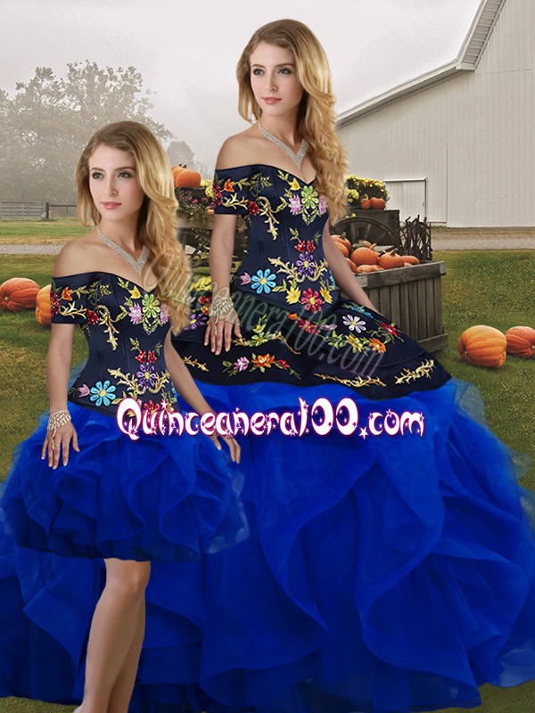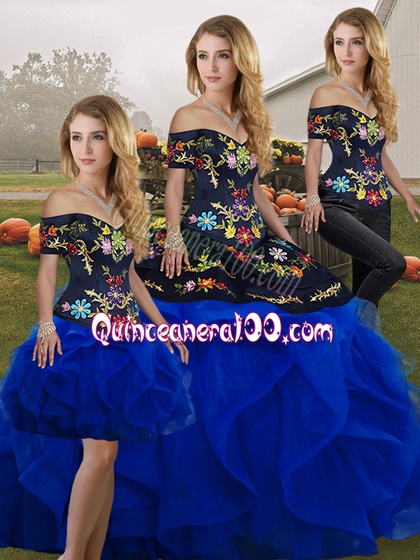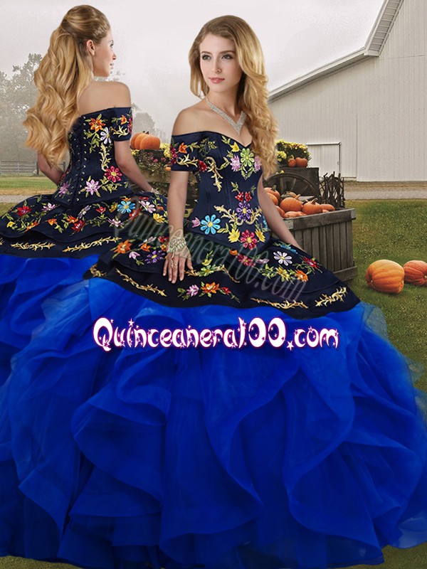 Neckline : Off the shoulder Shown Color : Royal Blue Silhouette : Three Pieces Sleeve Length : sleeveless Hemline : floor length Back Detail : Lace up Fabric : Tulle Embellishment : Embroidery,Ruffles Occasion : Military Ball,Sweet 16,Quinceanera Season : Spring,Summer,Fall,Winter