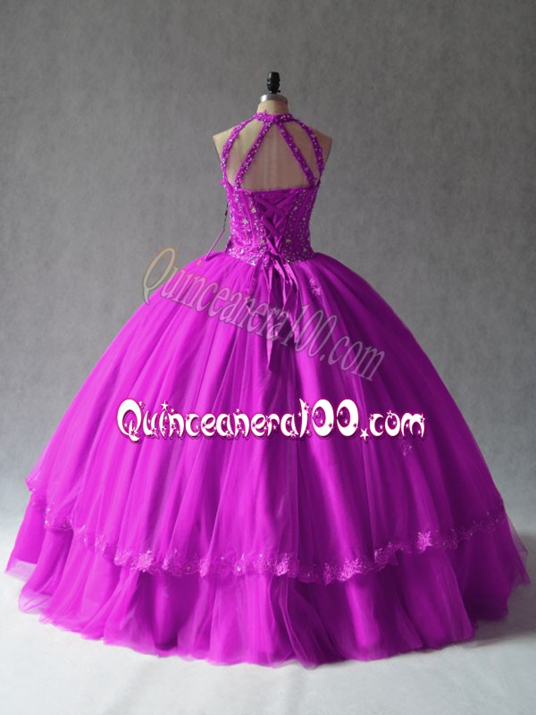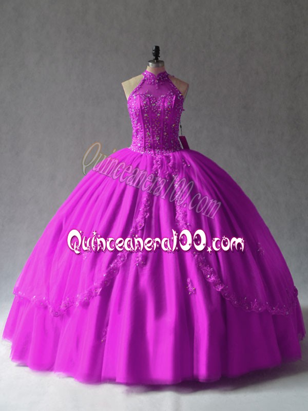Neckline : Halter topShown Color : FuchsiaSilhouette : Ball GownsSleeve Length : sleevelessHemline : floor lengthBack Detail : Lace upFabric : TulleEmbellishment : AppliquesOccasion : Sweet 16,QuinceaneraSeason : Spring,Summer,Fall,Winter