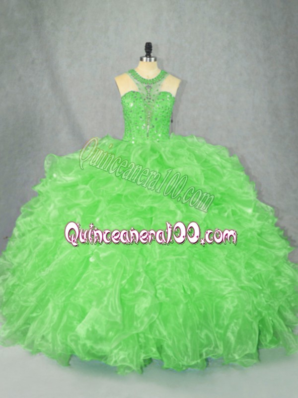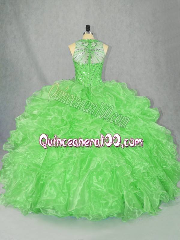 Neckline : ScoopShown Color : Spring GreenSilhouette : Ball GownsSleeve Length : sleevelessHemline : floor lengthBack Detail : ZipperFabric : OrganzaEmbellishment : Beading,RufflesOccasion : Sweet 16,QuinceaneraSeason : Spring,Summer,Fall,Winter