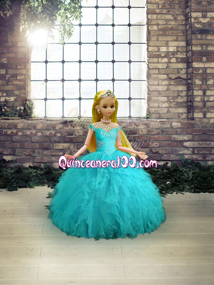 Neckline : Off the shoulder Shown Color : Aqua Blue Silhouette : Ball Gowns Sleeve Length : sleeveless Hemline : floor length Back Detail : Lace up Fabric : Tulle Embellishment : Beading,Ruffles Occasion : Military Ball,Sweet 16,Quinceanera Season : Spring,Summer,Fall,Winter