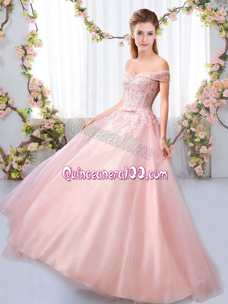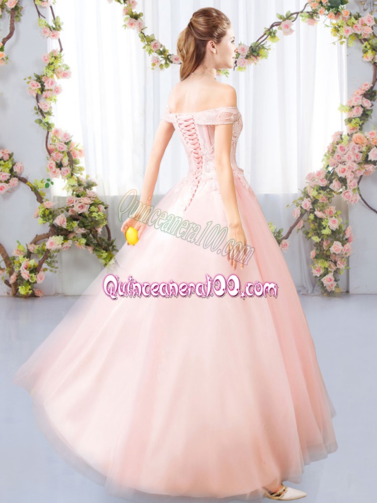 Neckline : Off the shoulderShown Color : Pink Silhouette : A-lineSleeve Length : sleevelessHemline : floor lengthBack Detail : Lace upFabric : TulleEmbellishment : Appliques,BeltOccasion : Wedding PartySeason : Spring,Summer,Fall,Winter
