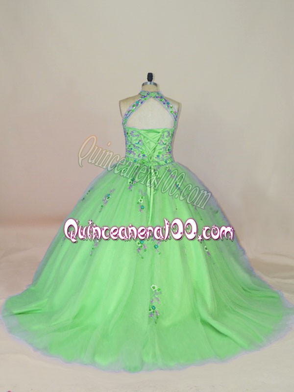 Neckline : Halter top Shown Color : Spring Green Silhouette : Ball Gowns Sleeve Length : sleeveless Back Detail : Lace up Fabric : Tulle Embellishment : Appliques,Embroidery Occasion : Sweet 16,Quinceanera Season : Spring,Summer,Fall,Winter