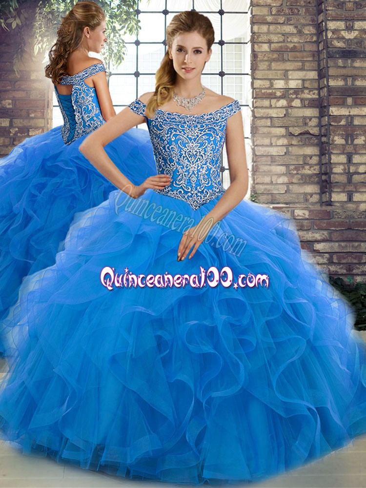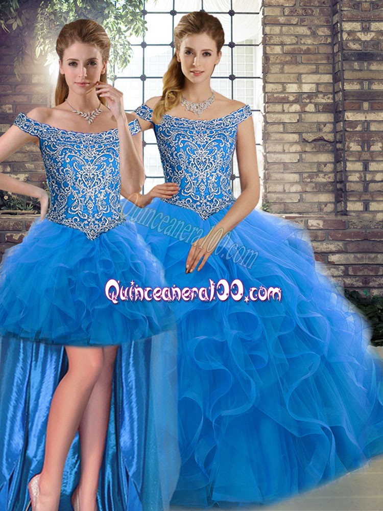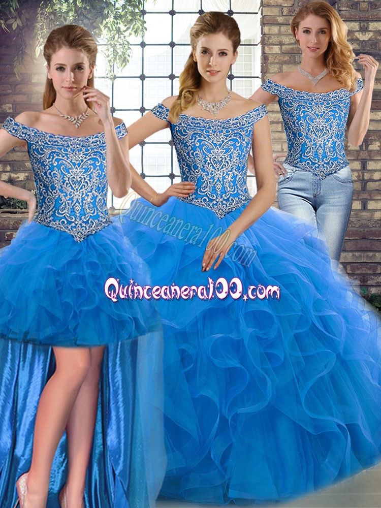 Neckline : Off the shoulderShown Color : BlueSilhouette : Three PiecesSleeve Length : sleevelessBack Detail : Lace upFabric : TulleEmbellishment : Beading,RufflesOccasion : Military Ball,Sweet 16,QuinceaneraSeason : Spring,Summer,Fall,Winter