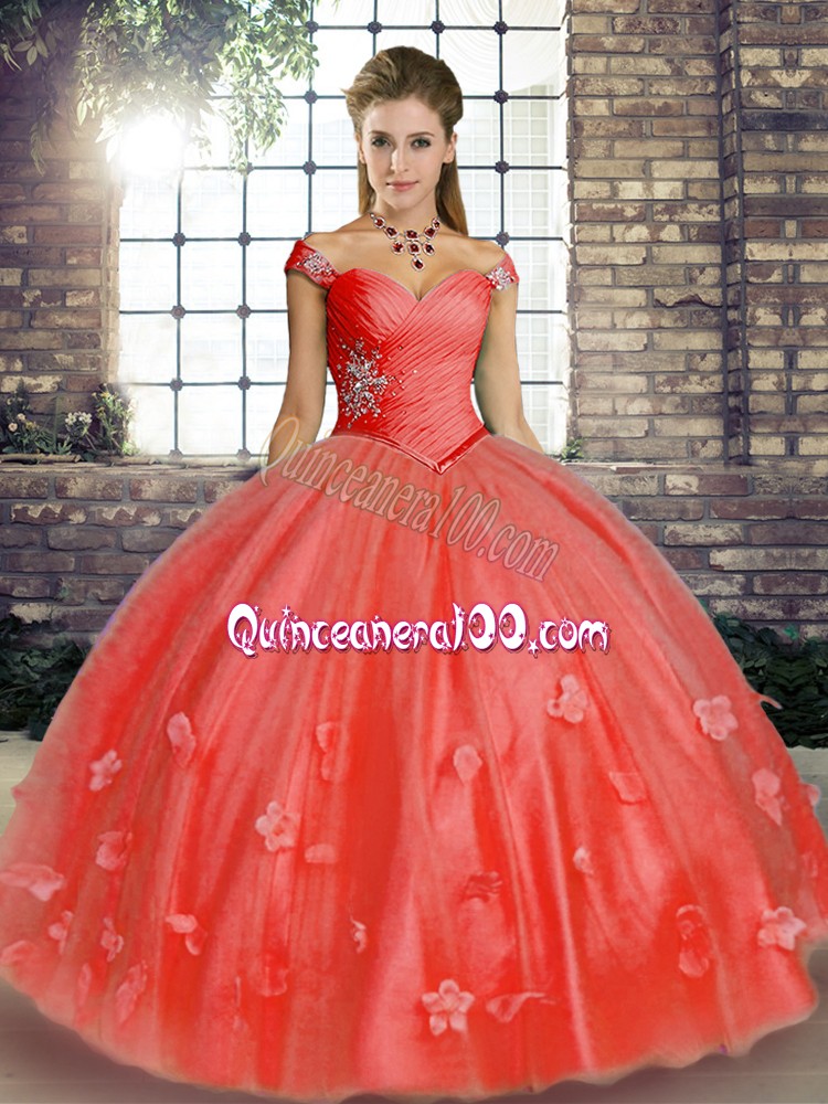 Neckline : Off the shoulderShown Color : Watermelon RedSilhouette : Ball GownsSleeve Length : sleevelessHemline : floor lengthBack Detail : Lace upFabric : TulleEmbellishment : Beading,AppliquesOccasion : Military Ball,Sweet 16,QuinceaneraSeason : Spring,Summer,Fall,Winter