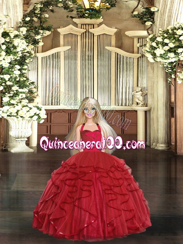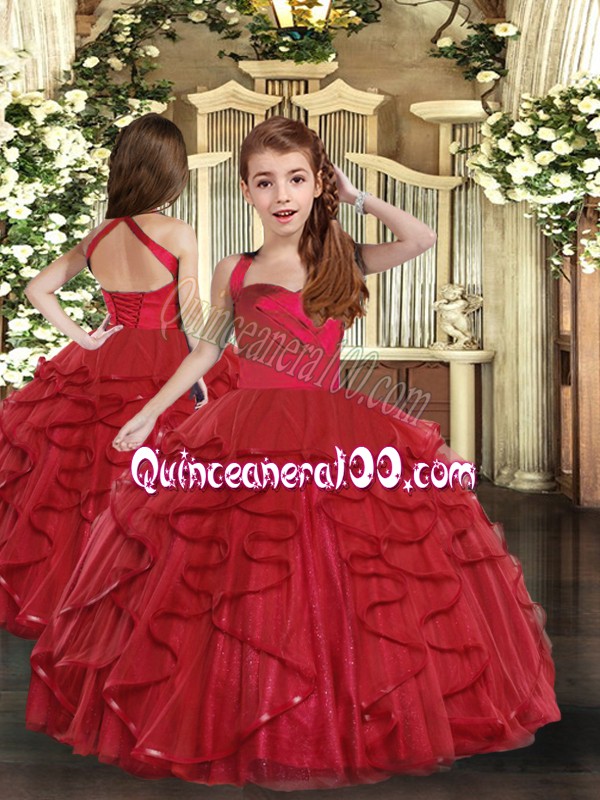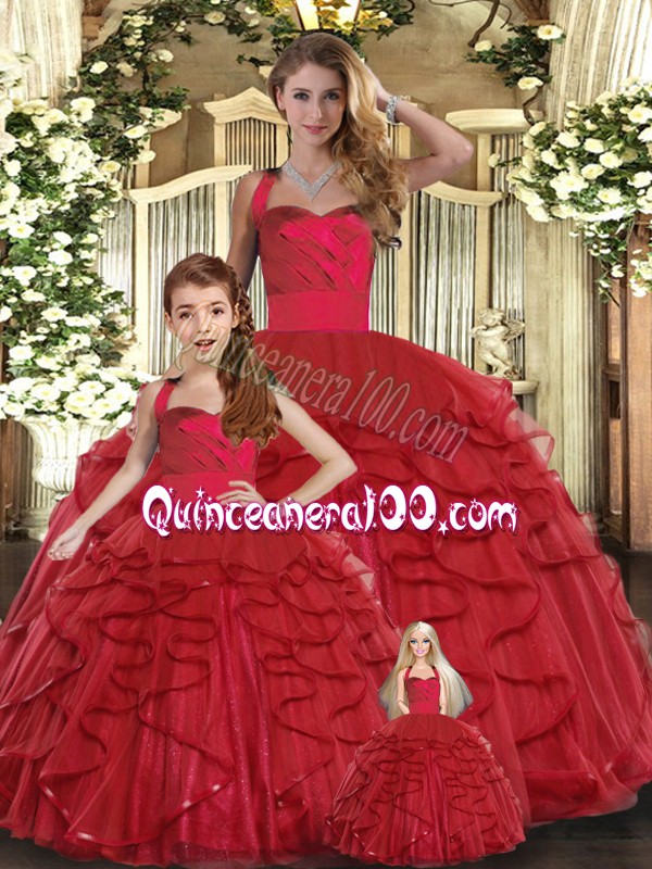 Neckline : StrapsShown Color : RedSilhouette : Ball GownsSleeve Length : sleevelessHemline : floor lengthBack Detail : Lace upFabric : TulleEmbellishment : RufflesOccasion : Sweet 16,QuinceaneraSeason : Spring,Summer,Fall,Winter
