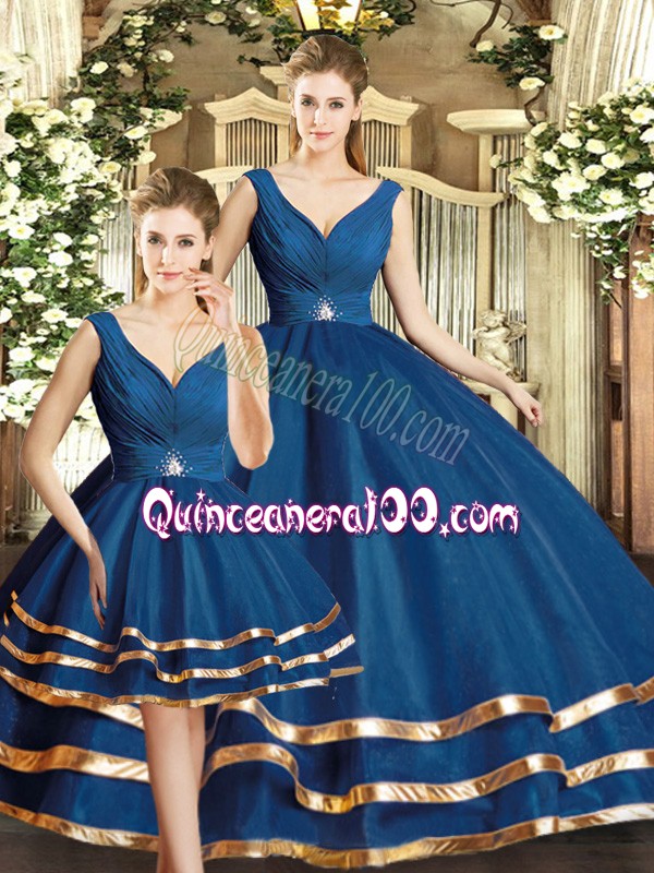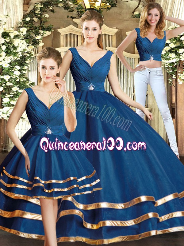 Neckline : V-neckShown Color : Navy BlueSilhouette : Three PiecesSleeve Length : sleevelessHemline : floor lengthBack Detail : BacklessFabric : TulleEmbellishment : Beading,Ruffled LayersOccasion : Military Ball,Sweet 16,QuinceaneraSeason : Spring,Summer,Fall,Winter
