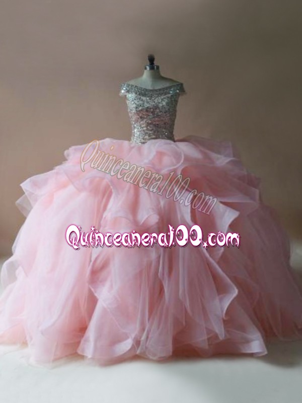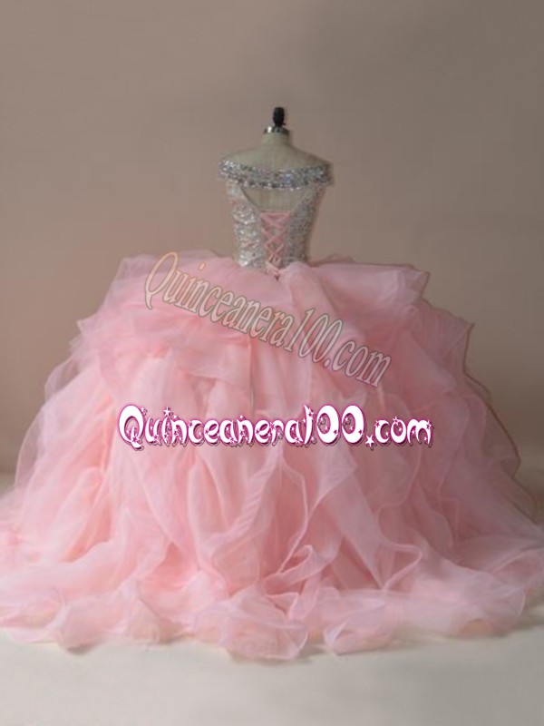 Neckline : Off the shoulderShown Color : Pink Silhouette : Ball GownsSleeve Length : sleevelessBack Detail : Lace upFabric : TulleEmbellishment : Beading,RufflesOccasion : Sweet 16,QuinceaneraSeason : Spring,Summer,Fall,Winter