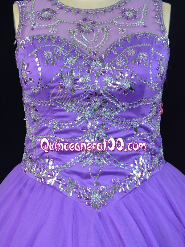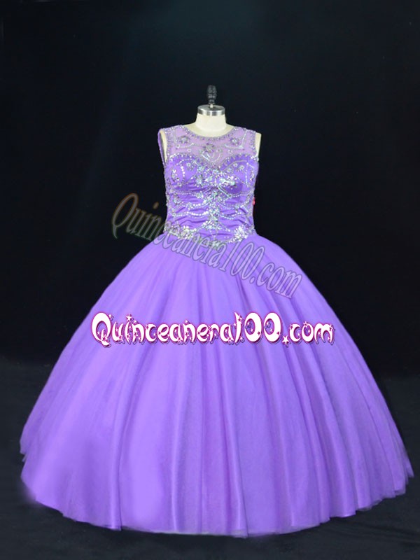 Neckline : ScoopShown Color : LavenderSilhouette : Ball GownsSleeve Length : sleevelessHemline : floor lengthBack Detail : Lace upFabric : TulleEmbellishment : BeadingOccasion : Sweet 16,QuinceaneraSeason : Spring,Summer,Fall,Winter