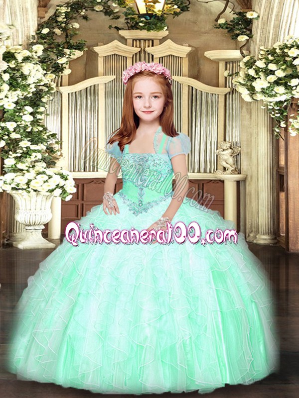 Neckline : StrapsShown Color : Apple GreenSilhouette : Ball GownsSleeve Length : sleevelessHemline : floor lengthBack Detail : Lace upFabric : TulleEmbellishment : Beading,RufflesOccasion : Party,Sweet 16,Wedding PartySeason : Spring,Summer,Fall,Winter