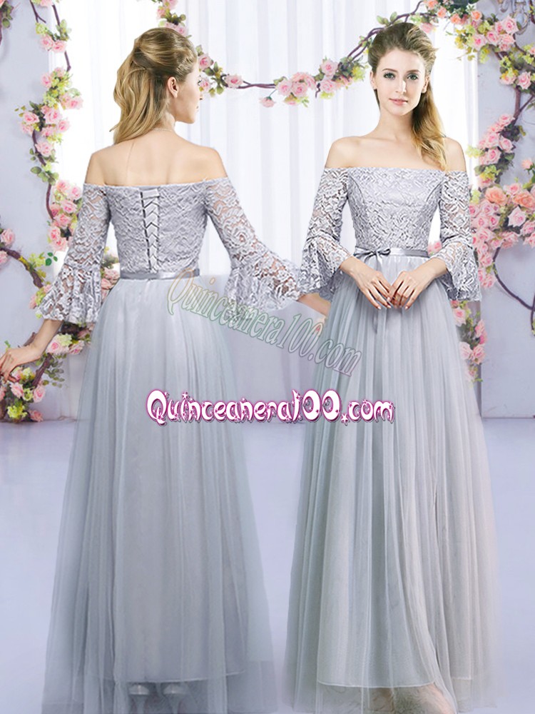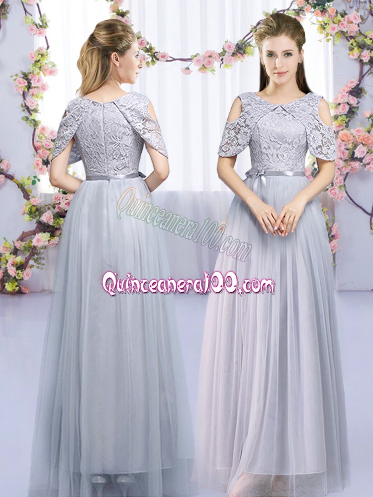 Neckline : High-neckShown Color : GreySilhouette : EmpireSleeve Length : half sleevesHemline : floor lengthBack Detail : ZipperFabric : TulleEmbellishment : Lace,BeltOccasion : Wedding PartySeason : Spring,Summer,Fall,Winter
