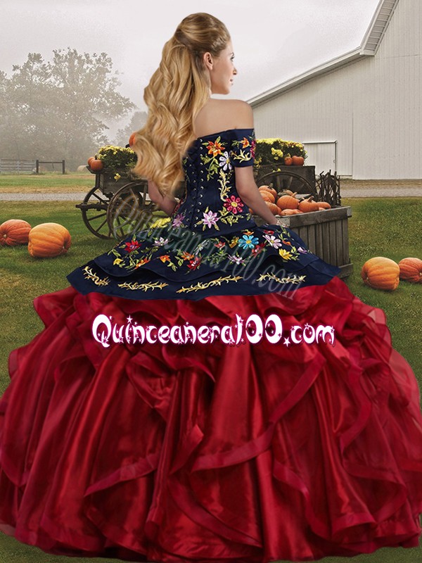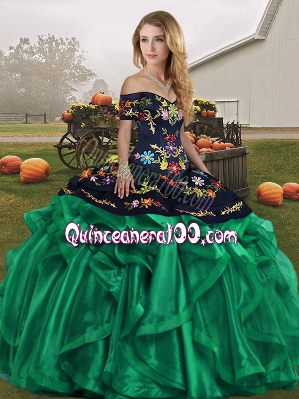 Neckline : Off the shoulder Shown Color : Green Silhouette : Ball Gowns Sleeve Length : sleeveless Hemline : floor length Back Detail : Lace up Fabric : Organza Embellishment : Embroidery,Ruffles Occasion : Military Ball,Sweet 16,Quinceanera Season : Spring,Summer,Fall,Winter