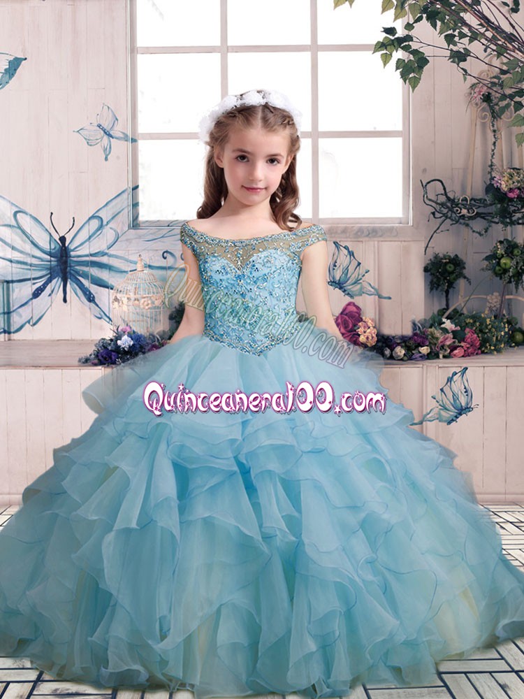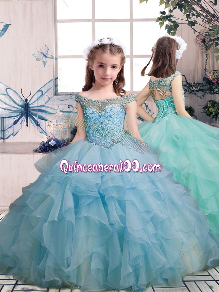Neckline : ScoopShown Color : Light BlueSilhouette : Ball GownsSleeve Length : sleevelessHemline : floor lengthBack Detail : Lace upFabric : OrganzaEmbellishment : Beading,RufflesOccasion : Party,Military Ball,Wedding PartySeason : Spring,Summer,Fall,Winter