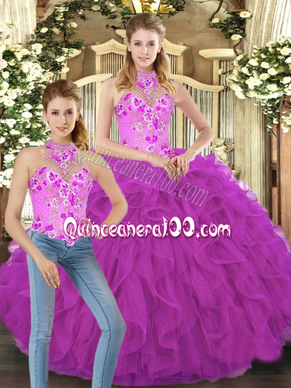 Neckline : Halter topShown Color : FuchsiaSilhouette : Two PiecesSleeve Length : sleevelessHemline : floor lengthBack Detail : Lace upFabric : TulleEmbellishment : Embroidery,RufflesOccasion : Military Ball,Sweet 16,QuinceaneraSeason : Spring,Summer,Fall,Winter