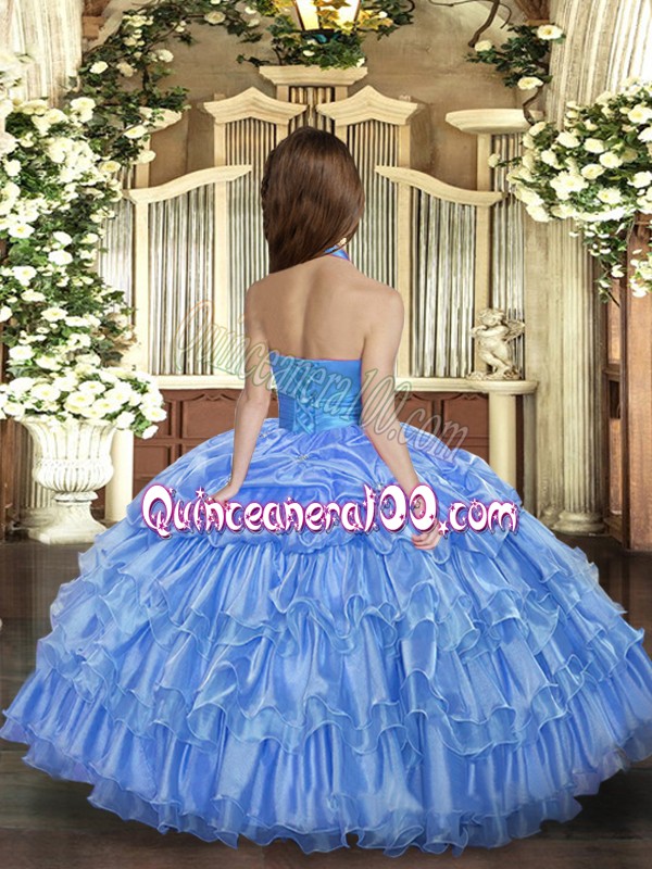 Neckline : Halter topShown Color : BlueSilhouette : Ball GownsSleeve Length : sleevelessHemline : floor lengthBack Detail : Lace upFabric : OrganzaEmbellishment : Ruffled LayersOccasion : Party,Wedding PartySeason : Spring,Summer,Fall,Winter