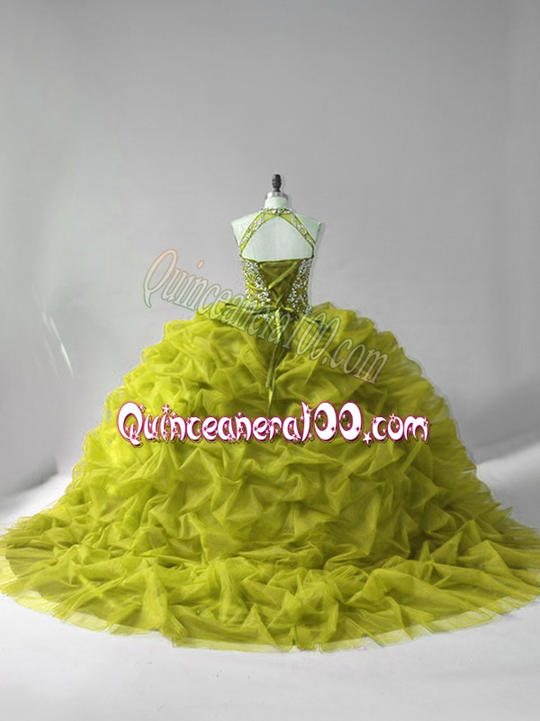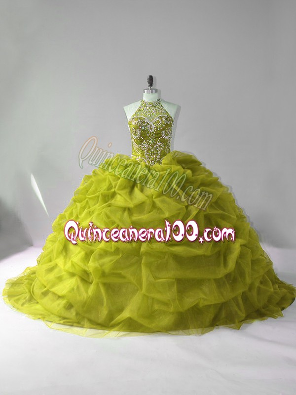 Neckline : Halter topShown Color : Olive GreenSilhouette : Ball GownsSleeve Length : sleevelessBack Detail : Lace upFabric : TulleEmbellishment : Beading,Pick UpsOccasion : Sweet 16,QuinceaneraSeason : Spring,Summer,Fall,Winter