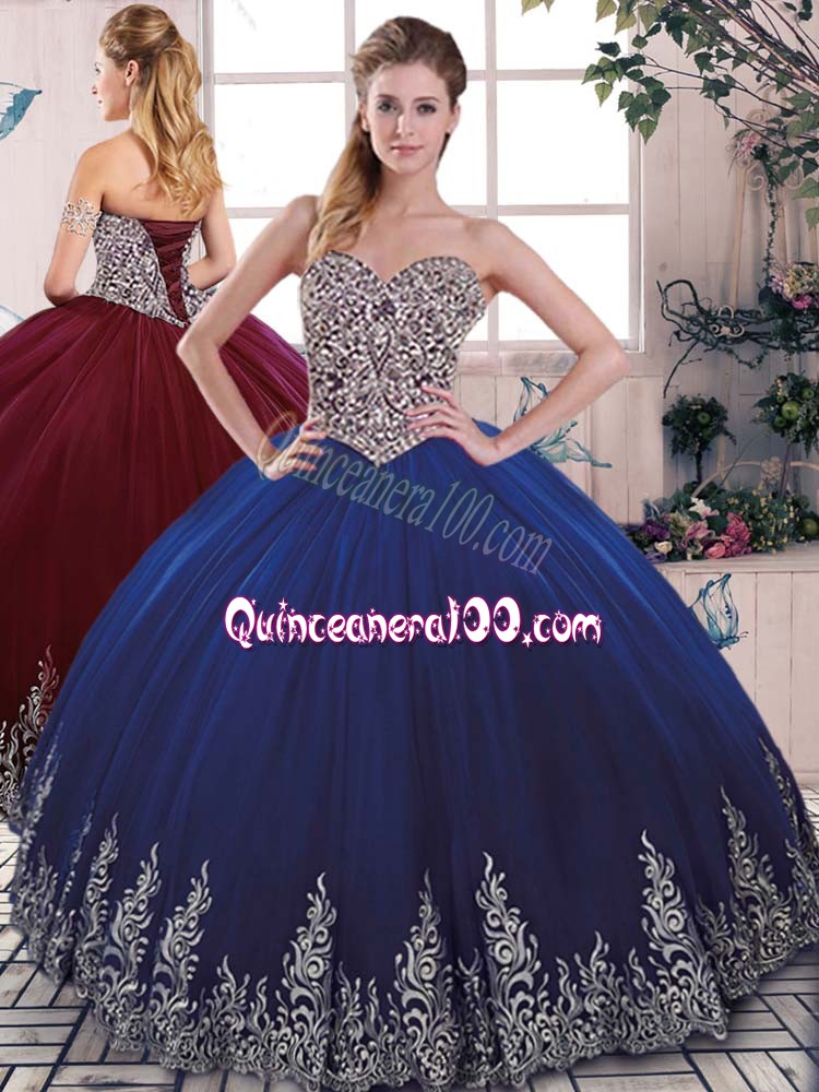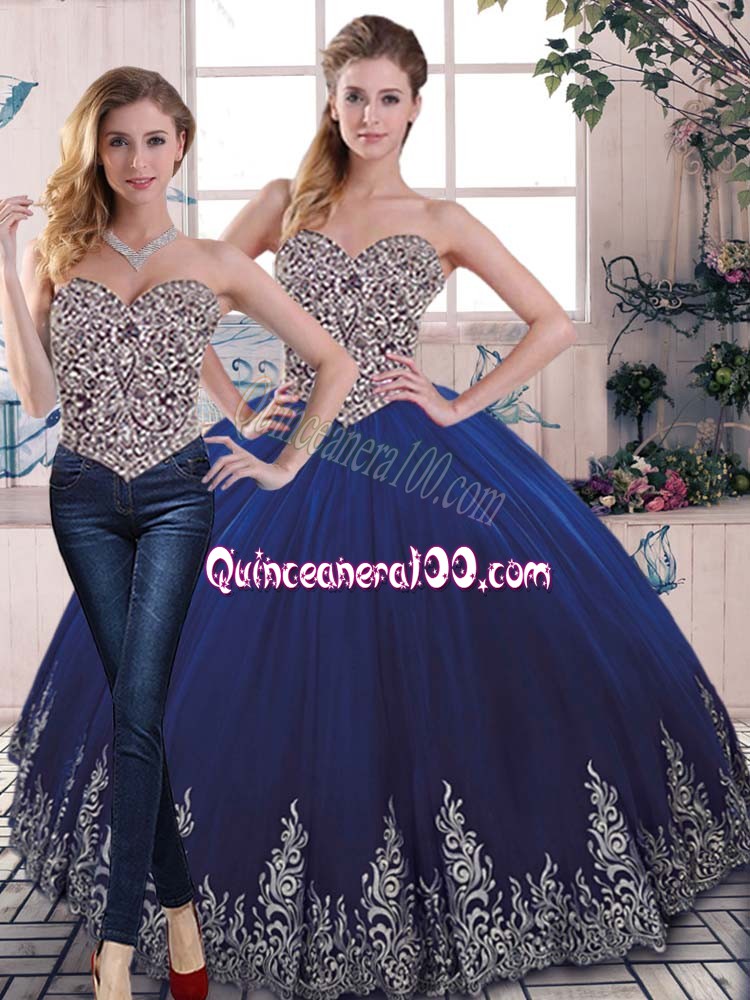 Neckline : SweetheartShown Color : Royal BlueSilhouette : Two PiecesSleeve Length : sleevelessHemline : floor lengthBack Detail : Lace upFabric : TulleEmbellishment : Beading,EmbroideryOccasion : Sweet 16,QuinceaneraSeason : Spring,Summer,Fall,Winter