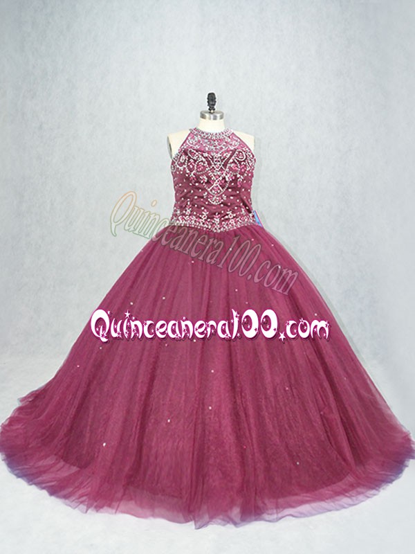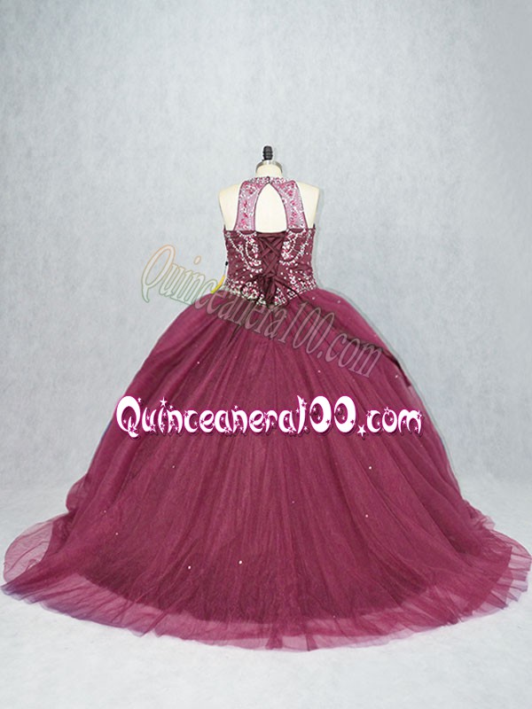 Neckline : ScoopShown Color : BurgundySilhouette : Ball GownsSleeve Length : sleevelessBack Detail : Lace upFabric : TulleEmbellishment : BeadingOccasion : Sweet 16,QuinceaneraSeason : Spring,Summer,Fall,Winter
