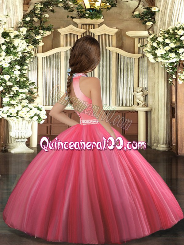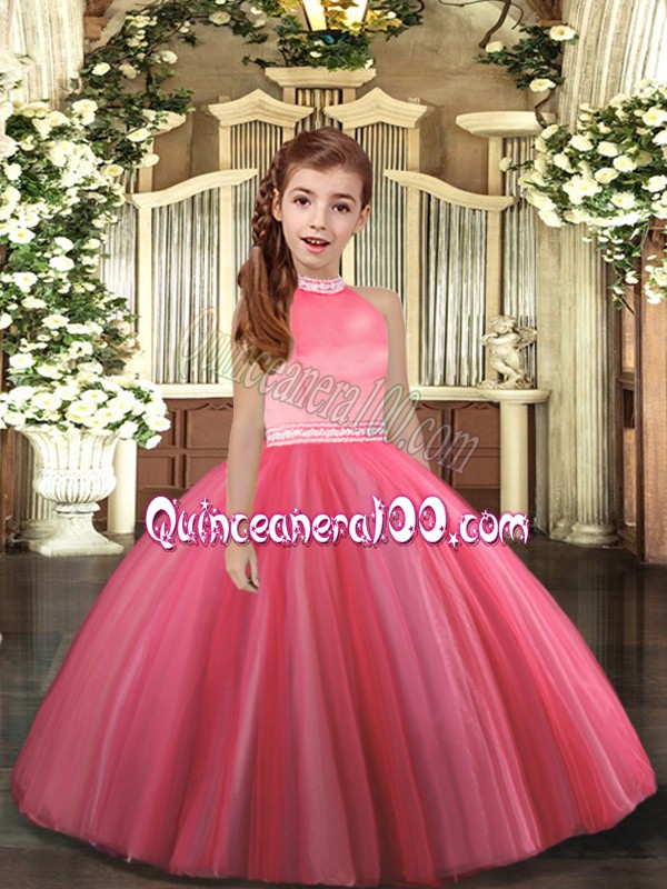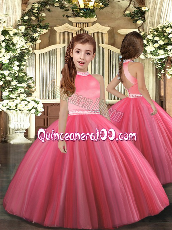 Neckline : High-neckShown Color : Coral RedSilhouette : Ball GownsSleeve Length : sleevelessHemline : floor lengthBack Detail : ZipperFabric : TulleEmbellishment : BeadingOccasion : Party,Sweet 16,Wedding PartySeason : Spring,Summer,Fall,Winter