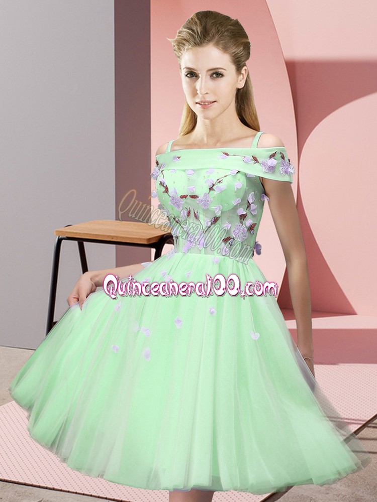 Neckline : Off the shoulder Shown Color : Spring Green Silhouette : Empire Sleeve Length : short sleeves Hemline : knee length Back Detail : Lace up Fabric : Tulle Embellishment : Appliques Occasion : Wedding Party Season : Spring,Summer,Fall