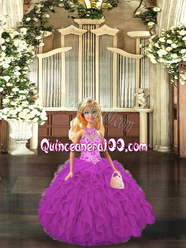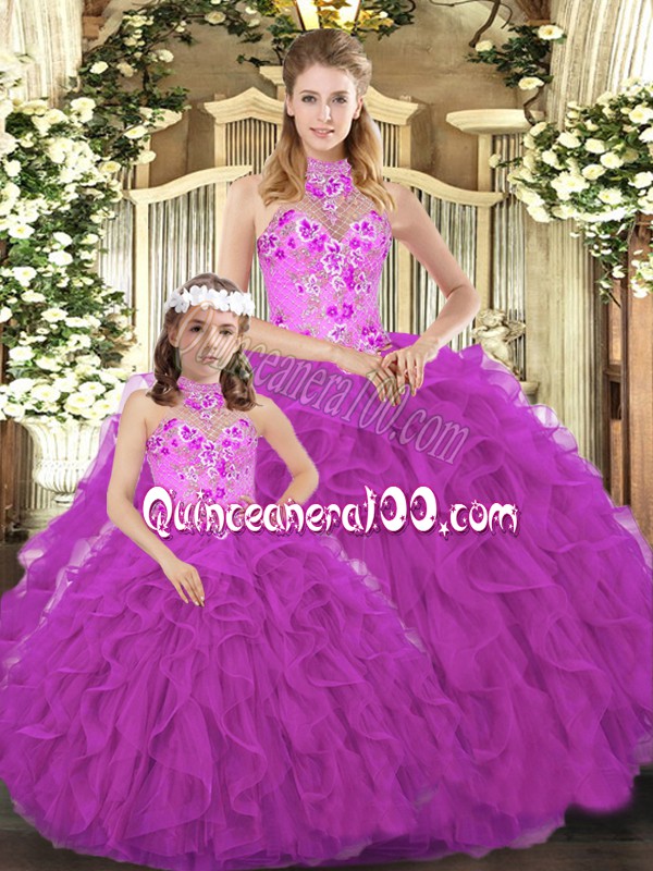 Neckline : Halter topShown Color : FuchsiaSilhouette : Ball GownsSleeve Length : sleevelessHemline : floor lengthBack Detail : Lace upFabric : TulleEmbellishment : Embroidery,RufflesOccasion : Military Ball,Sweet 16,QuinceaneraSeason : Spring,Summer,Fall,Winter